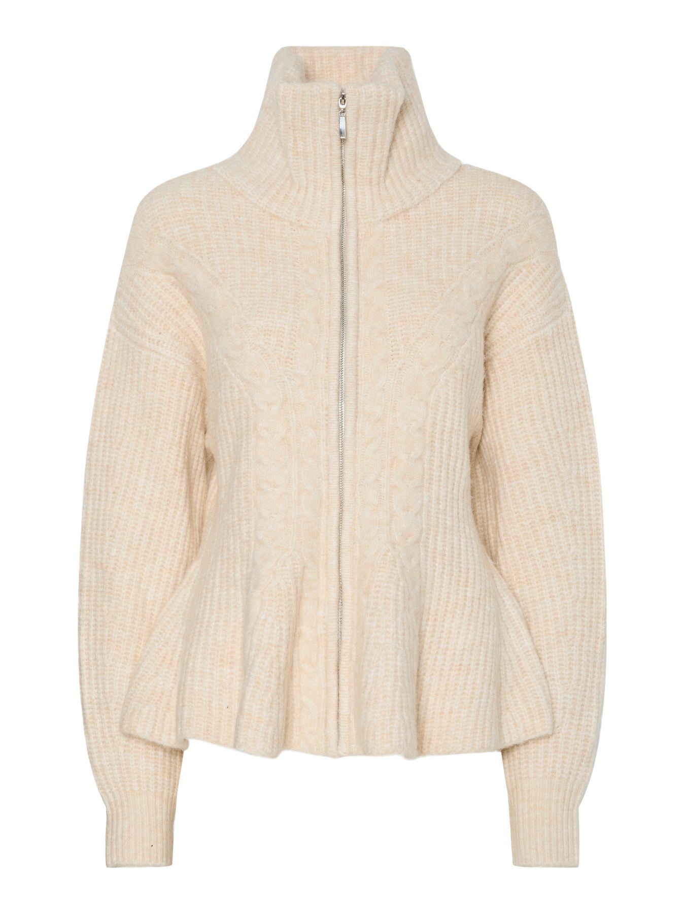 Super smuk og blød cardigan fra YAS. Den har fine snoninger fortil og er i en grov ribskrikket kvalitet. Den har høj hals, tovejs lynlås og en super fin feminin facon.