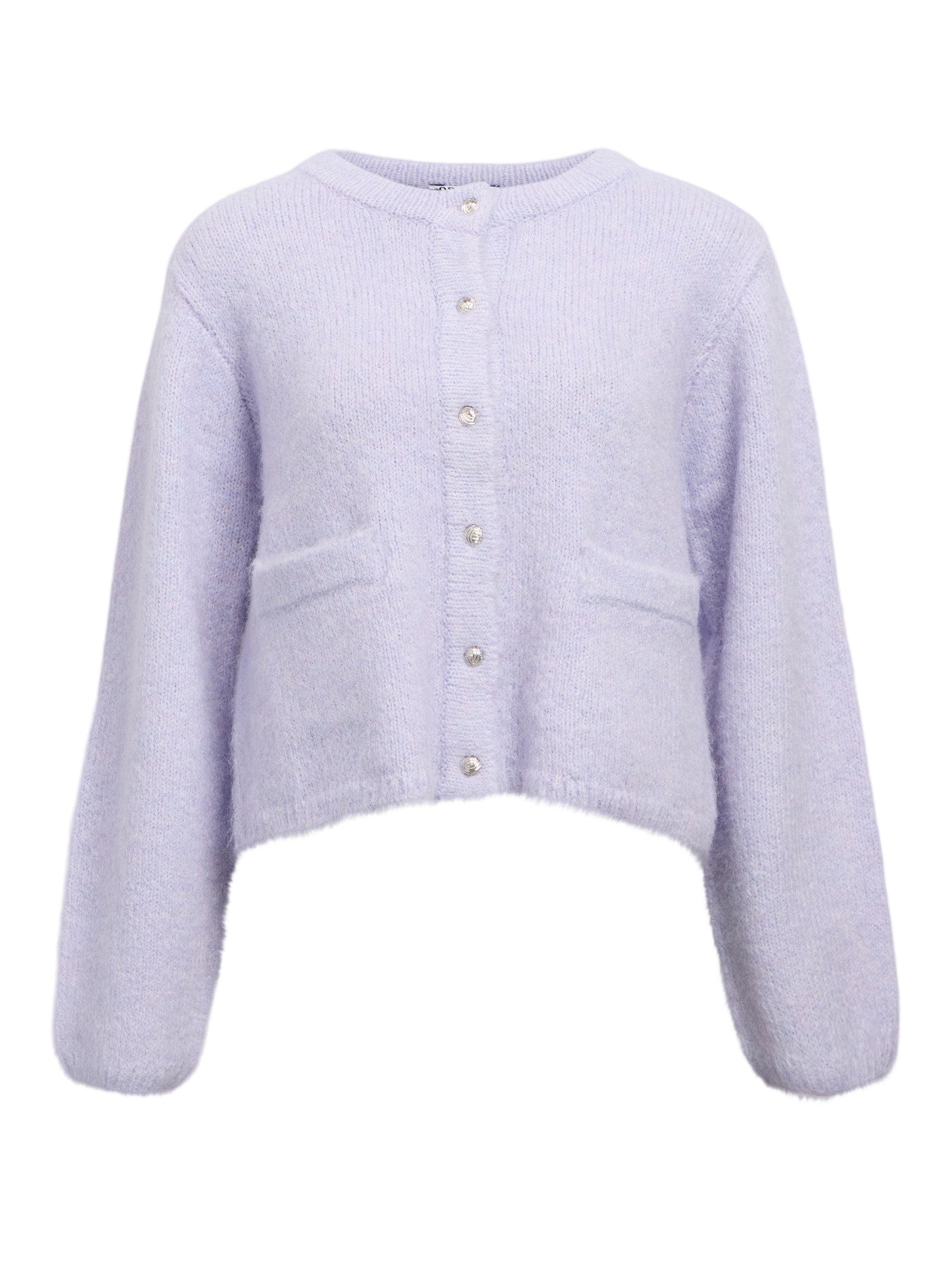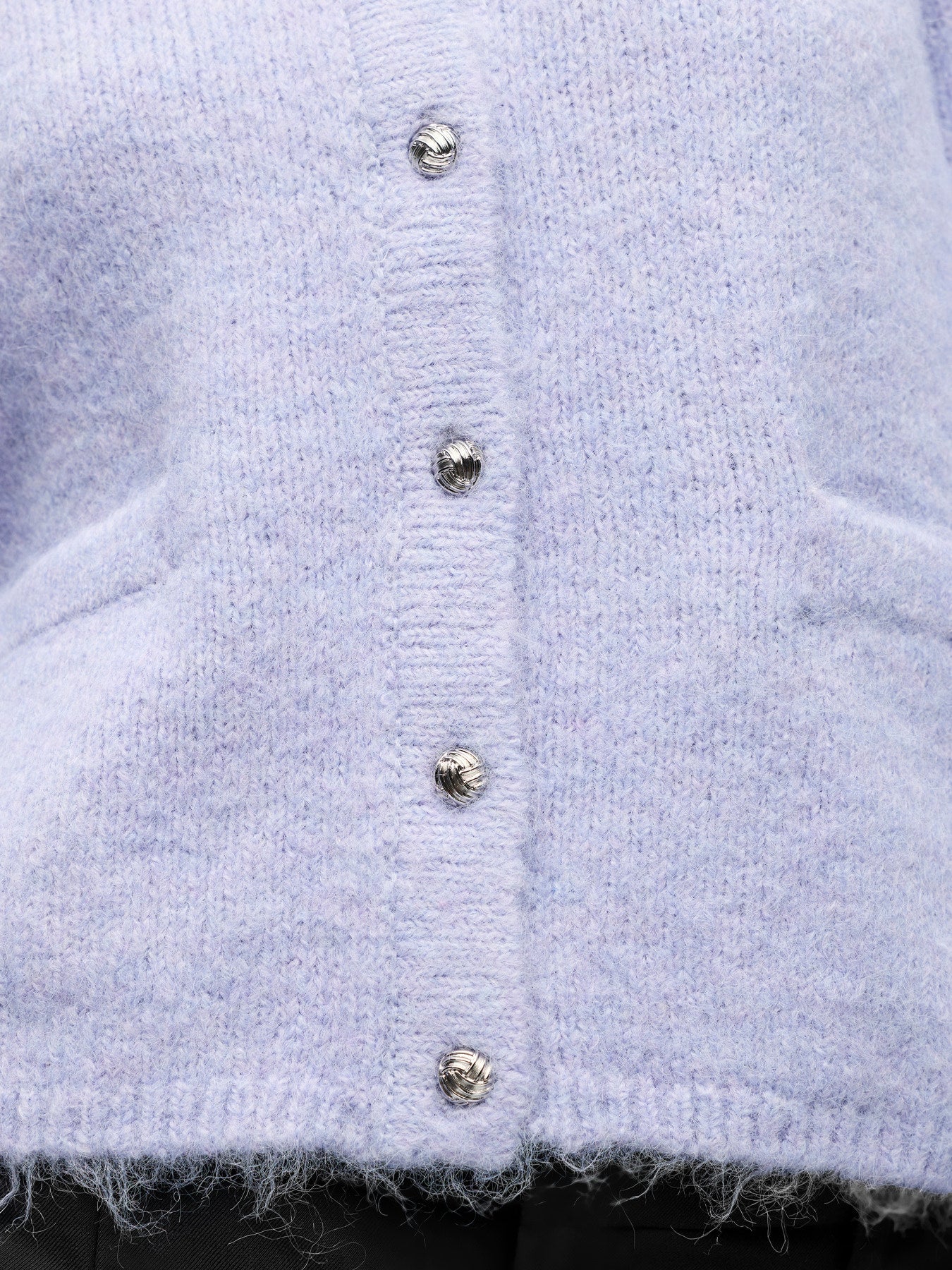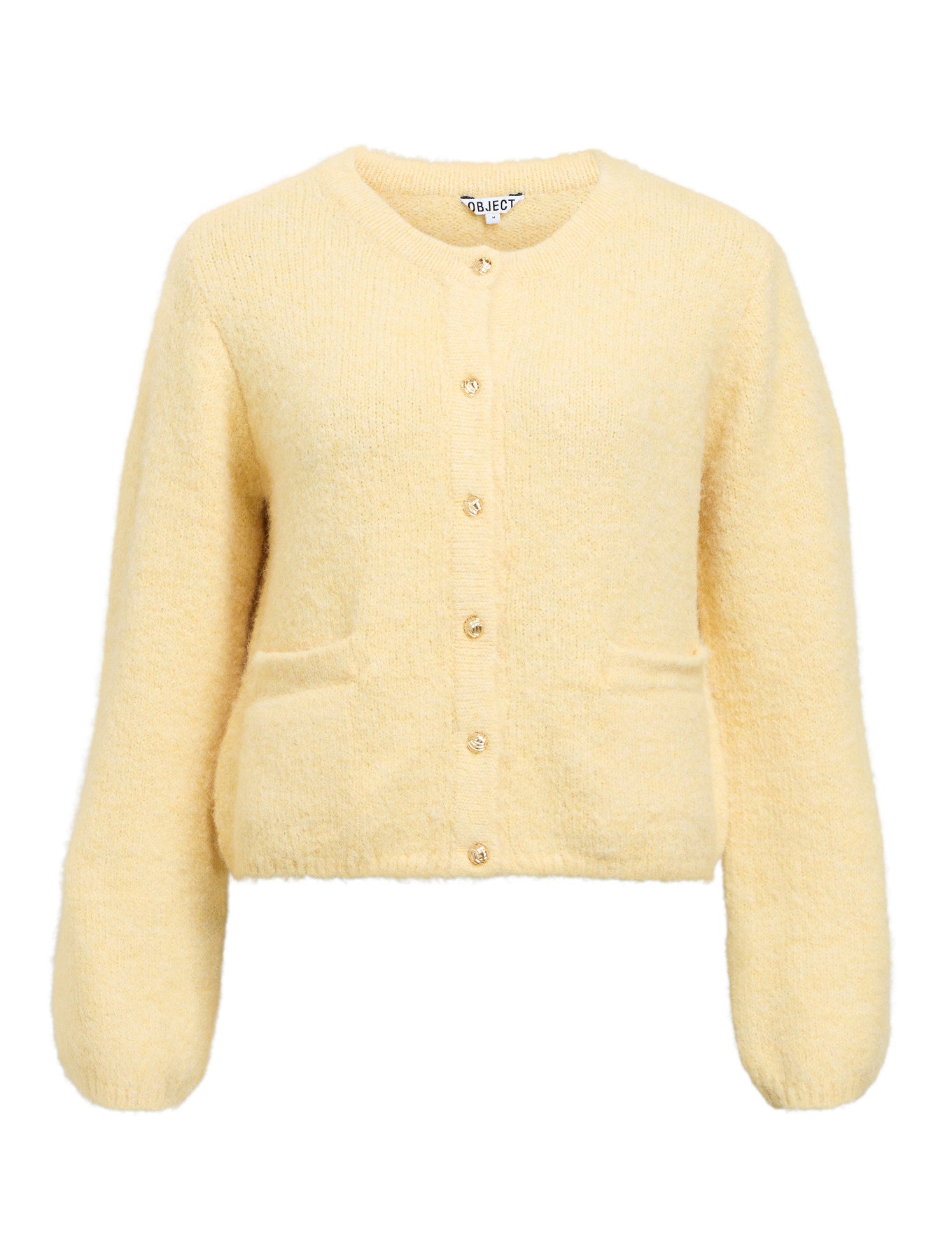 Super blød og lækker cardigan fra Object i en lækker lys lilla farve. Den har en løs pasform og ballon ærmer, findes i tre skønne farver og et feminint touch i form af smukke sølv knapper på den lilla og guldknapper på den gule og beige.