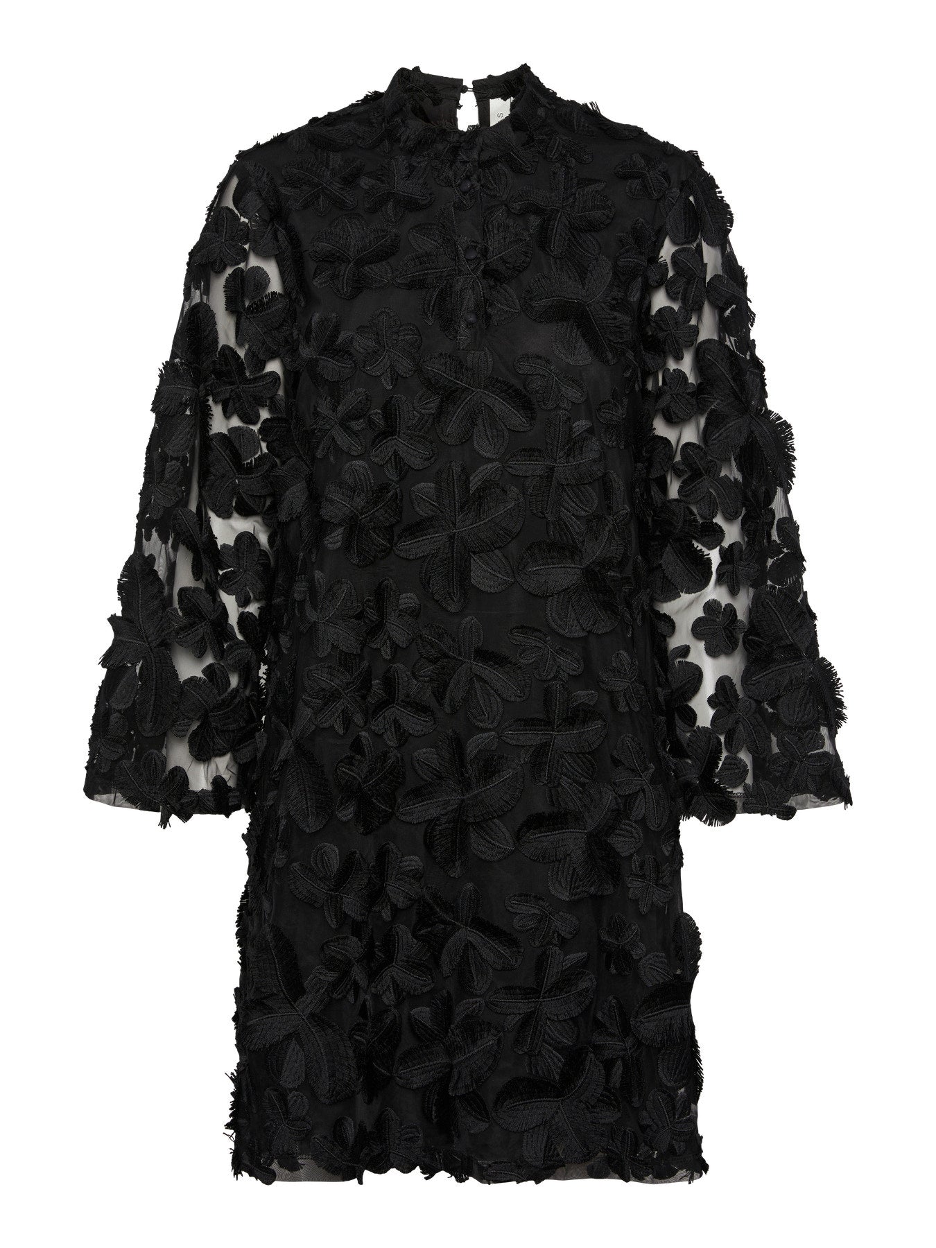 Unik kjole, i en super god facon fra YAS. Kjolen har 3/4 ærmer med let vidde, og er i en rummelig A-model. Det florlette stof har påsat 3D blomster, der giver et super flot udtryk. Ærmerne er gennemsigtige men på kropssykket er der et ekstra lag, der sikre den ikke er gennemsigtig.