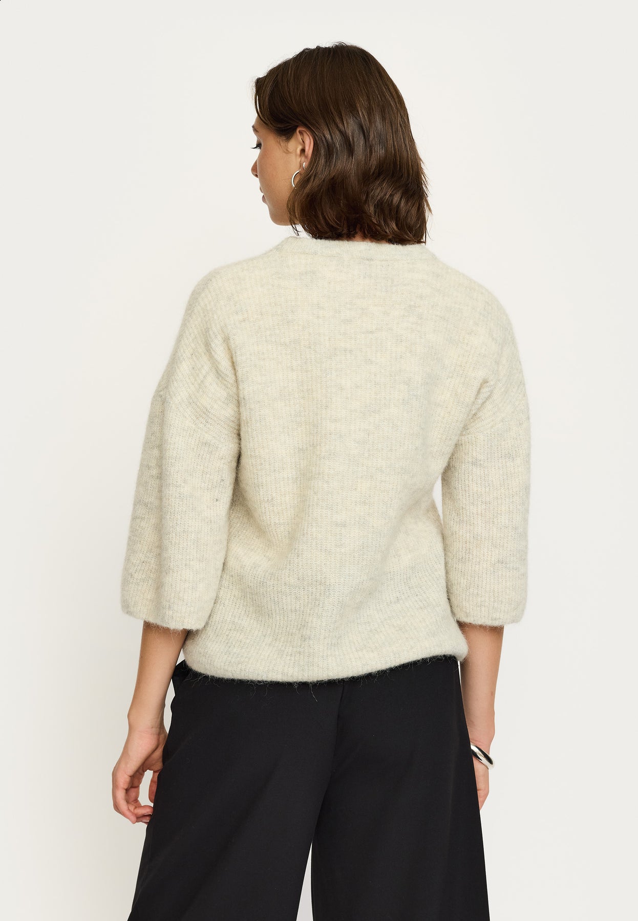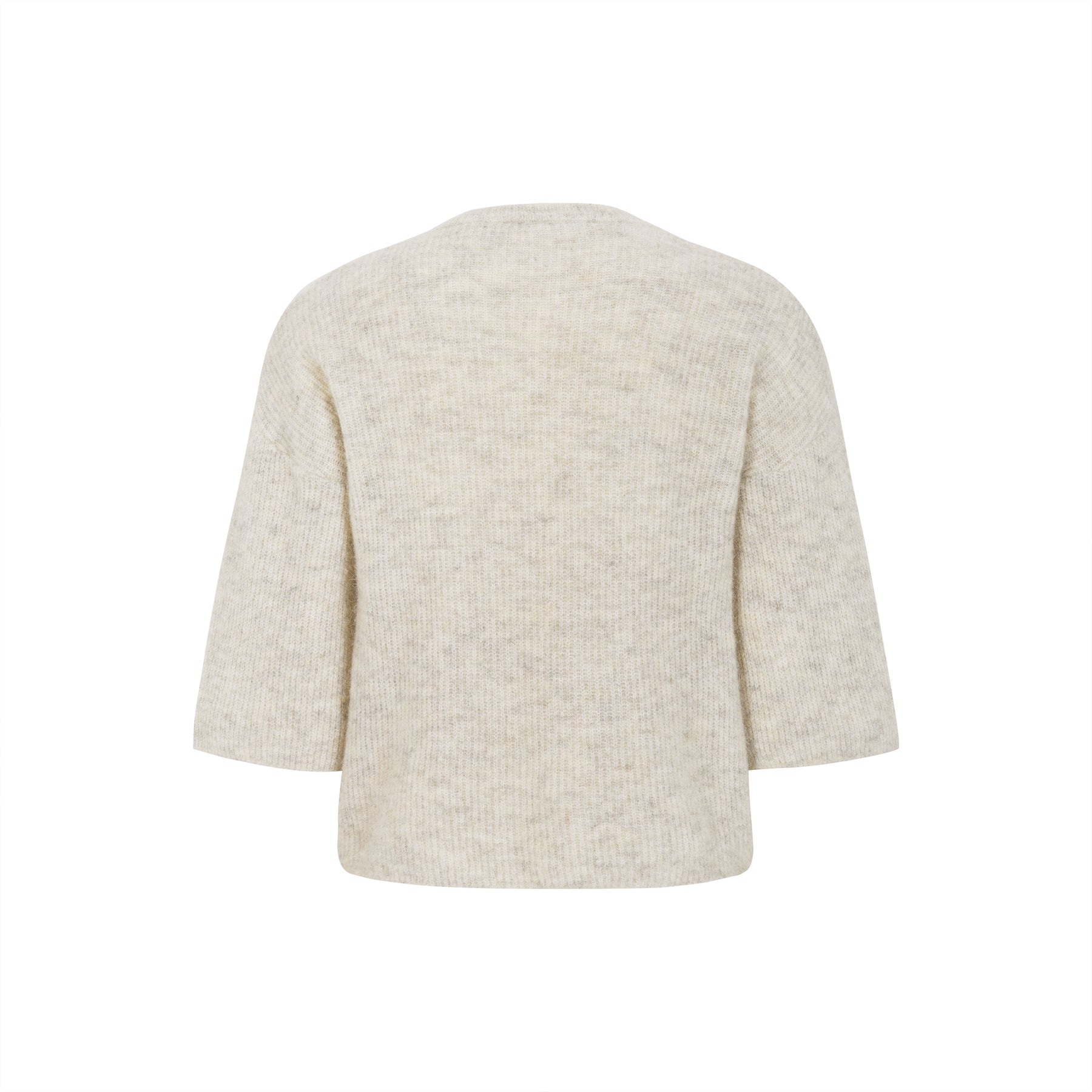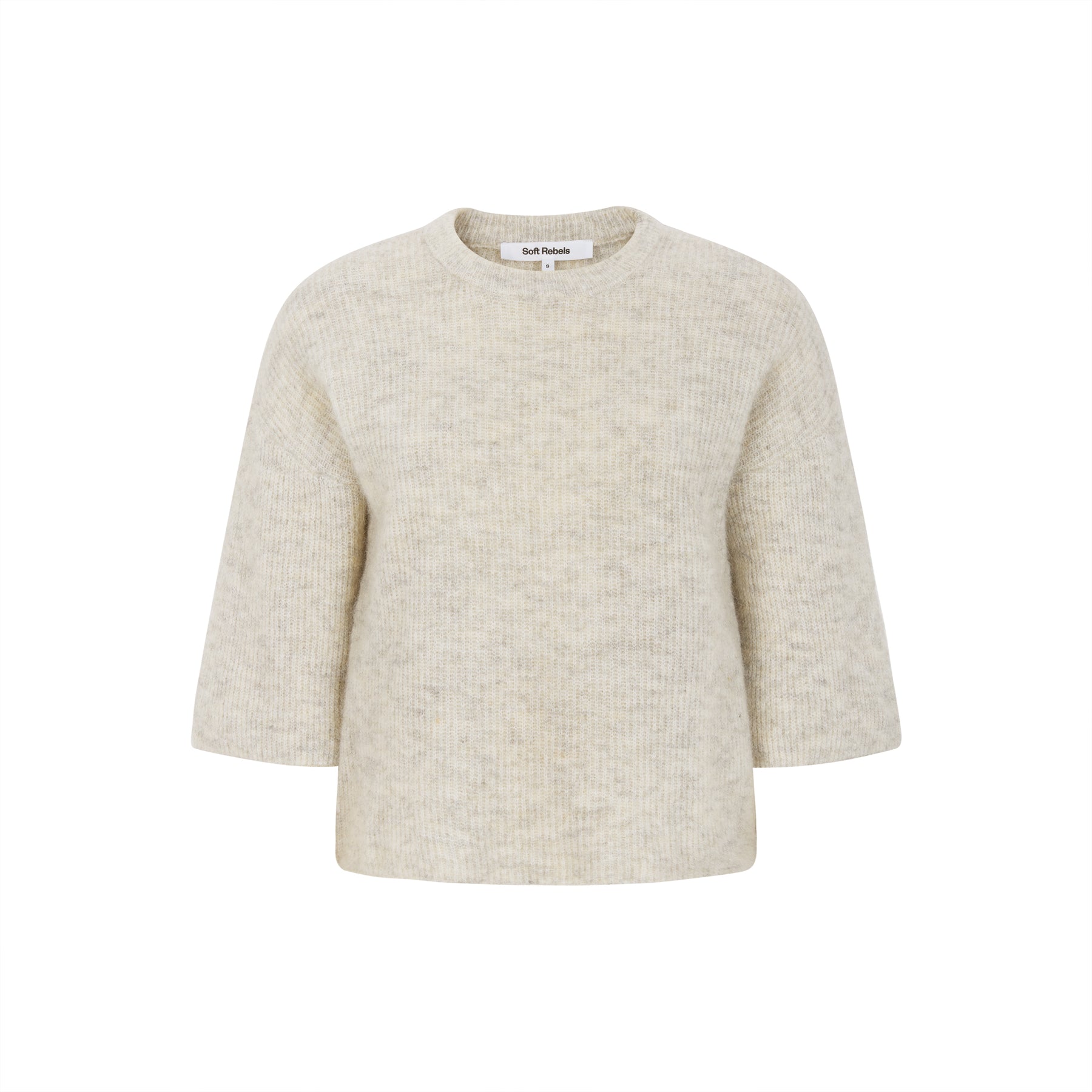 Hema strikken fra Softrebels er en elegant og alsidig striktrøje med 3/4 ærmer, der giver et let og feminint udtryk. Den luksuriøse blanding af uld, alpaka og nylon gør den både blød, varm og behagelig at have på, mens et strejf af spandex sikrer en flot pasform, der holder sig.