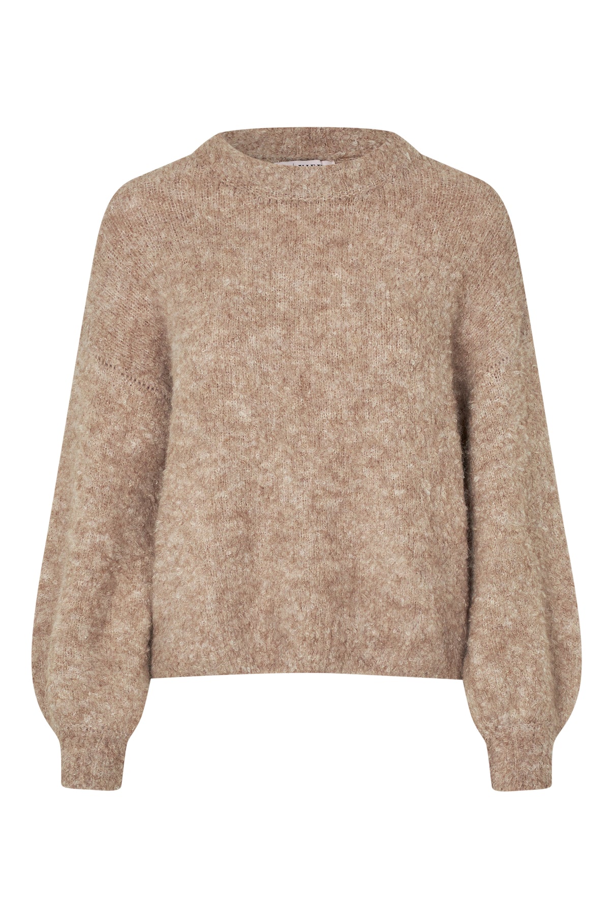 Patrisia strik Pullover fra A-View, er en løstsiddende strik med løse ærmer med drop shoulder. Ærmerne er løse med en pufeffekt, og strikningen har en høj halsudskæring.