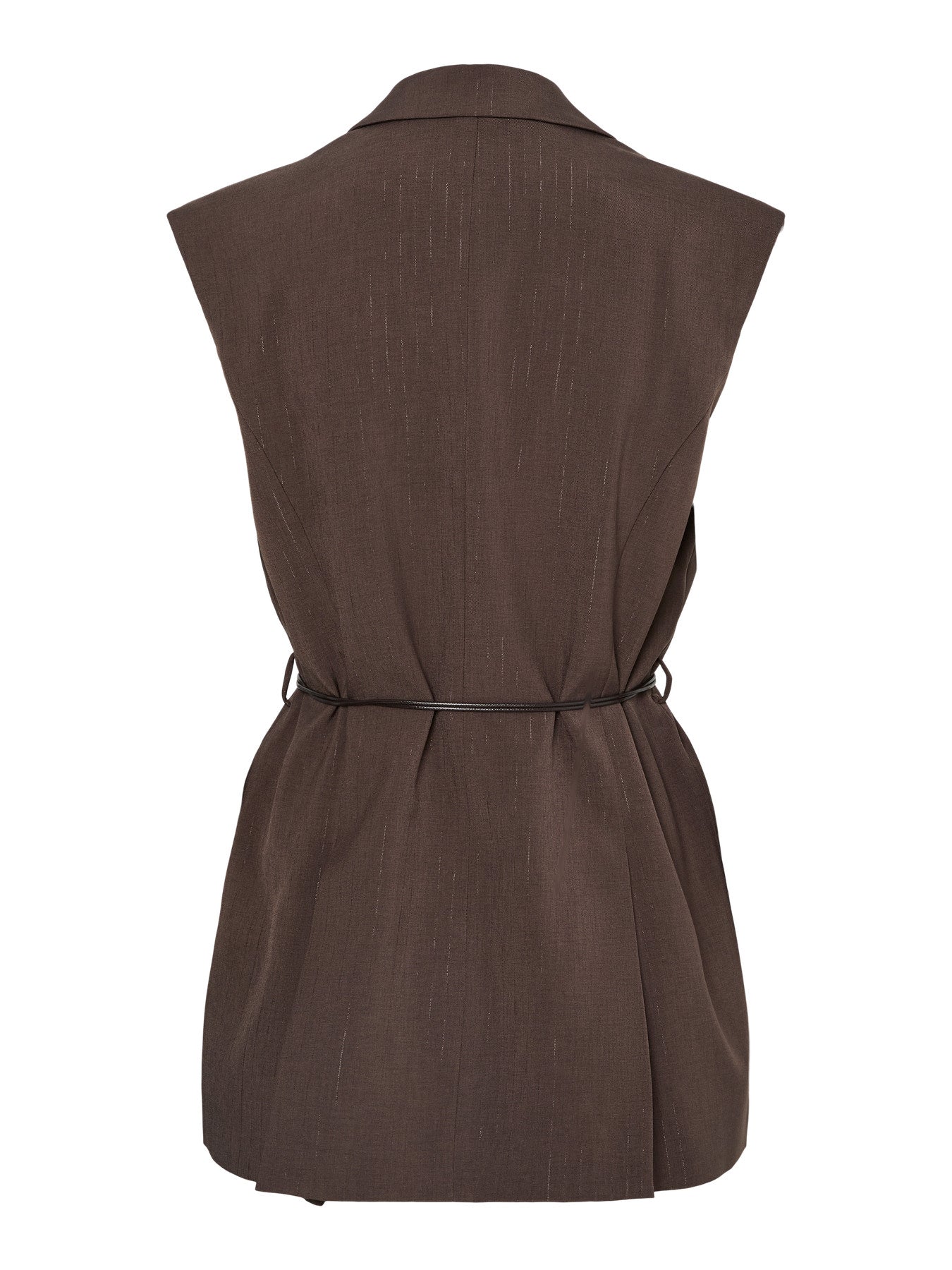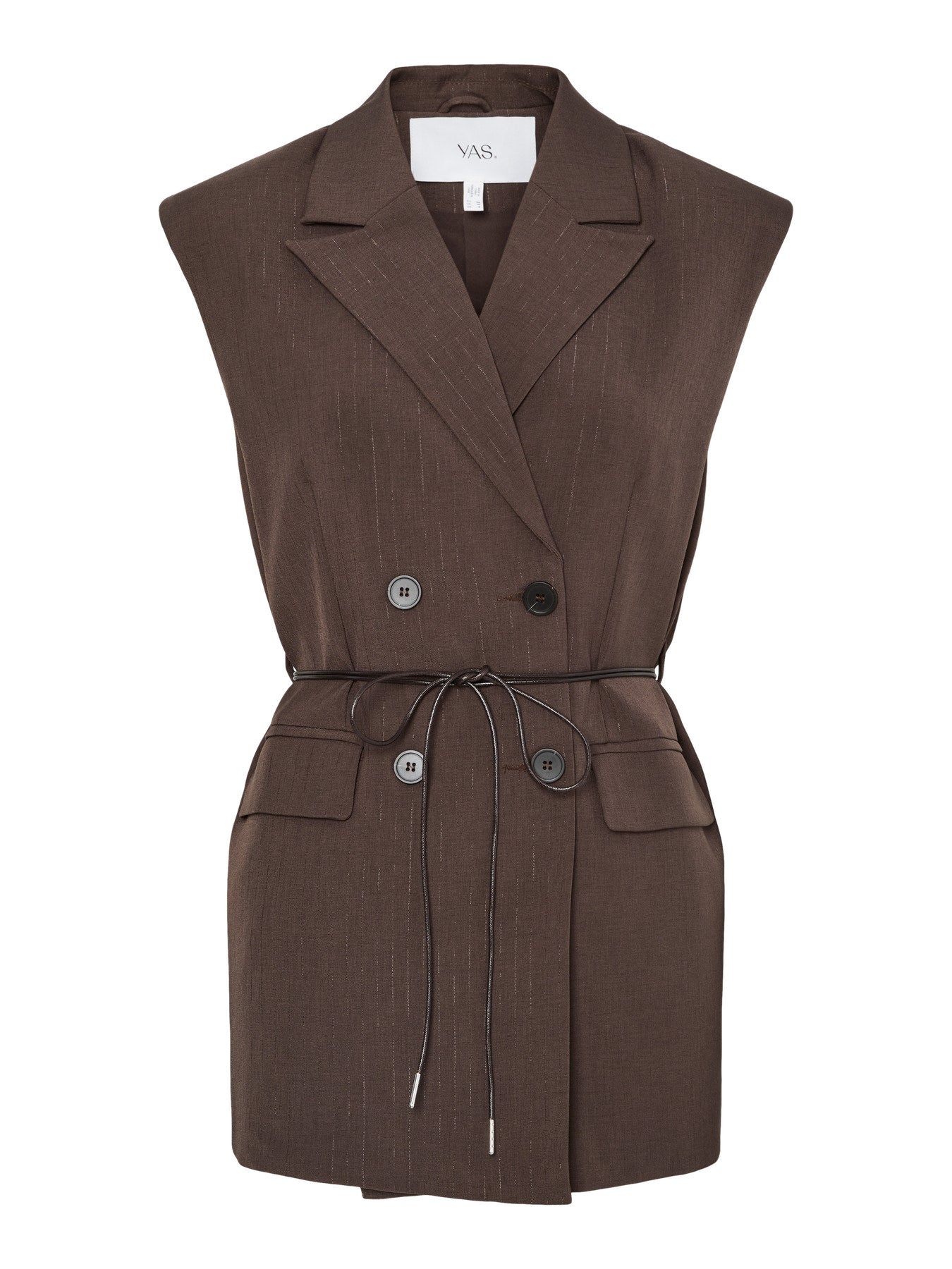 Elegant og lækker "blazer vest" fra YAS. Den er dobbeltraderet, har slidser bagpå, snyde lommer og er med et aftageligt talje bånd i læder look. Den smukke chokolade brune farve, og den blanke pinstripe, giver vesten et elegant og eksklusivt look. Brug den til dine ynglings bukser eller sammen med de matchende bukser som et sæt.